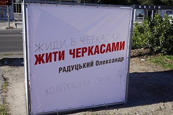 | Выборы завершились. Но осадок остался. Так, до сих пор неизвестно, кто испортил антисемитскими надписями агитационные «кубы» кандидата на пост мэра Черкасс Александра Радуцкого. Предвыборный слоган кандидата «Жити Черкасами» был дополнен надписью «Жиди в Черкасах — коліївщина скоро!». |